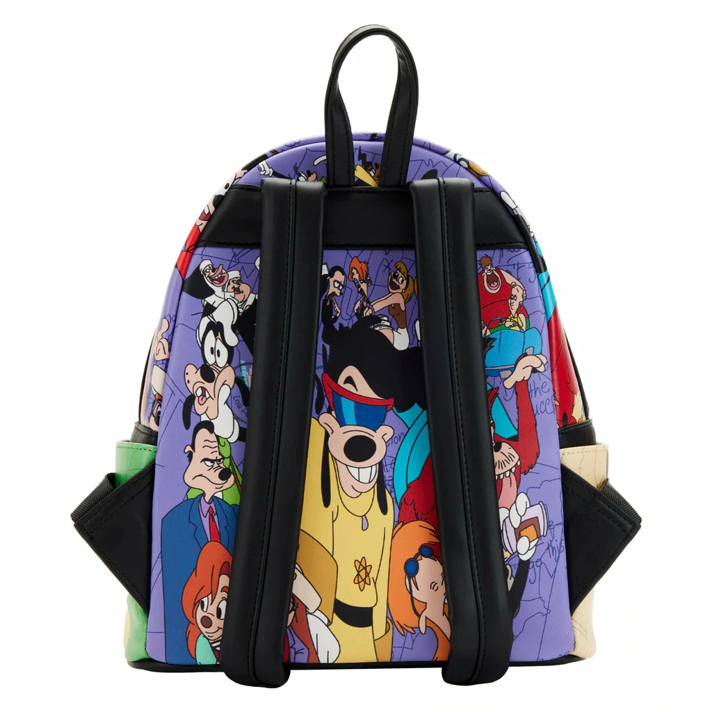 The Loungefly A Goofy Movie Moments Mini Backpack is made of vegan leather (polyurethane). Bag has adjustable shoulder straps, sturdy metal hardware, and features printed details. Take note of the coordinating inside lining.