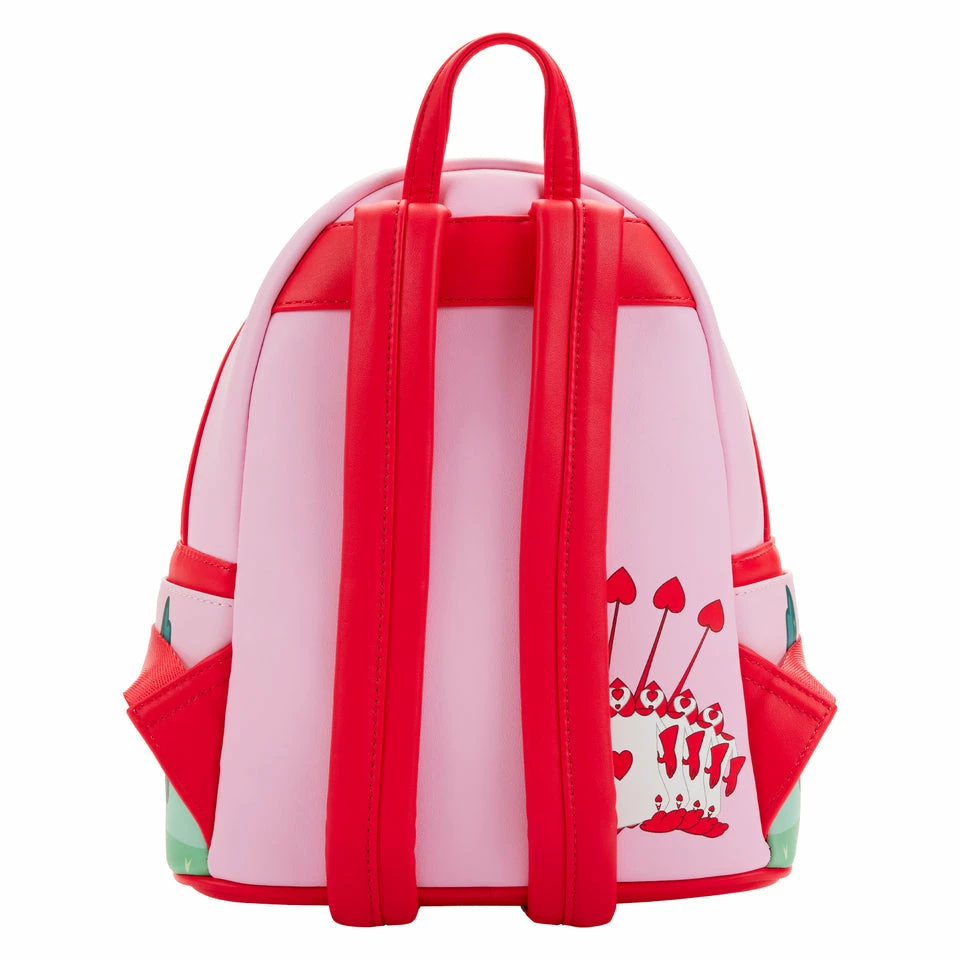 The Loungefly Disney Alice in Wonderland Painting the Roses Red Mini Backpack is made of vegan leather (polyurethane). Bag has adjustable shoulder straps, sturdy metal hardware, appliques, and printed details.