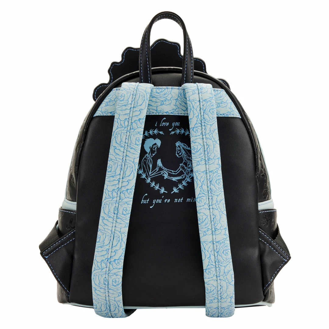 The Loungefly Corpse Bride Emily Bouquet Mini Backpack is made of vegan leather (polyurethane). Bag has adjustable shoulder straps and sturdy metal hardware. Additional features include faux flowers, applique, debossed, and printed details. Take note of the coordinating inside lining.