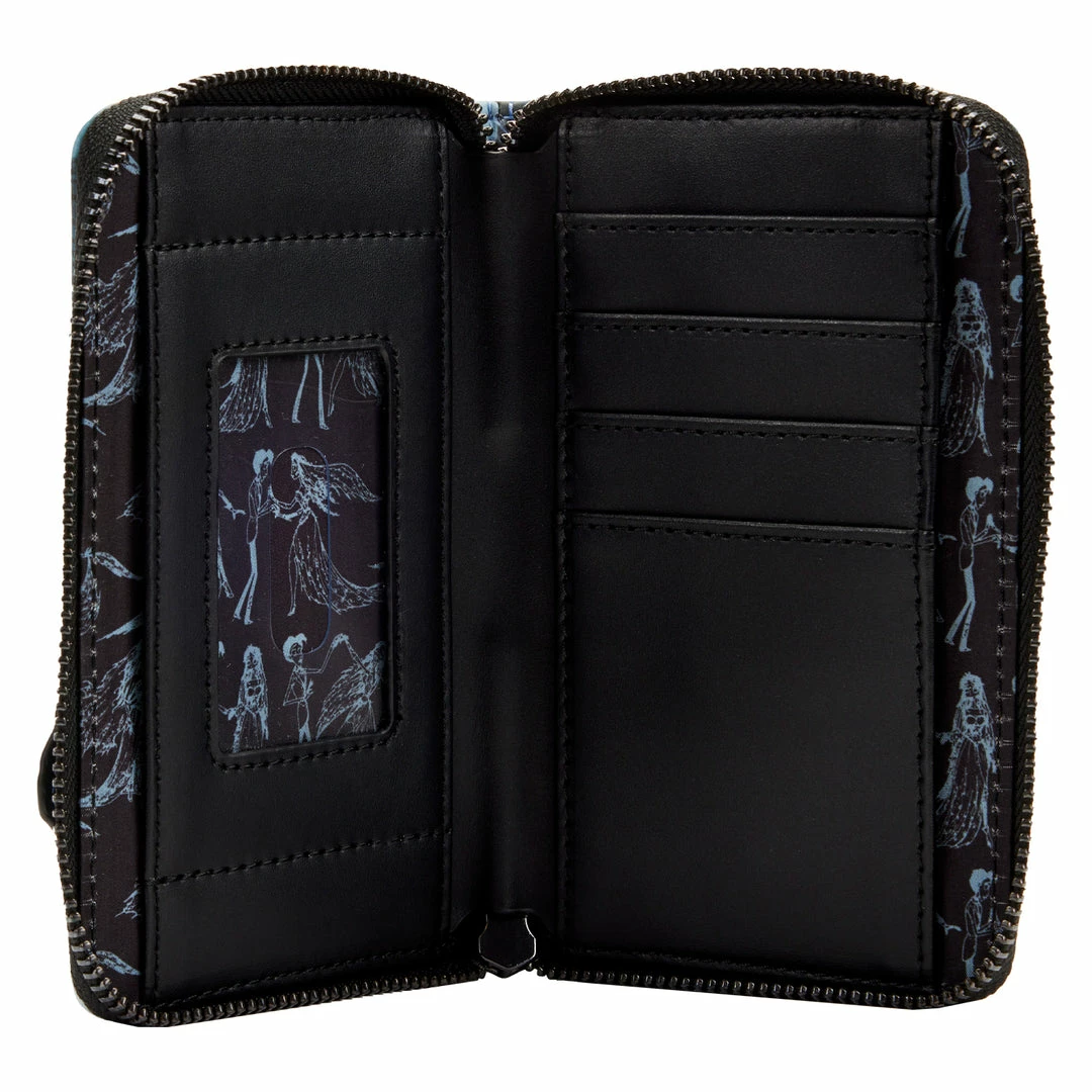 Love can be found even in the strangest of circumstances. The Loungefly Corpse Bride Emily Forest Zip Around Wallet shows a scene from Tim Burton’s 2005 animated film, The Corpse Bride. On the front, Emily walks through the hazy woods while dressed in her wedding gown. On the back, Emily appears to an unsuspecting Victor as he stumbles through a graveyard. With 5 slots for holding cards and a clear slot for holding your ID, this wistful accessory has room to keep all your belongings safe as you travel between worlds.