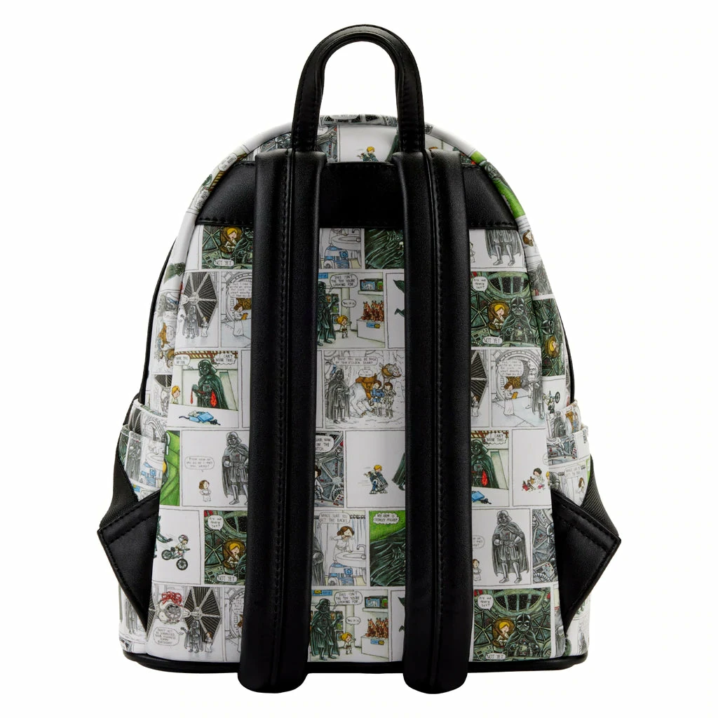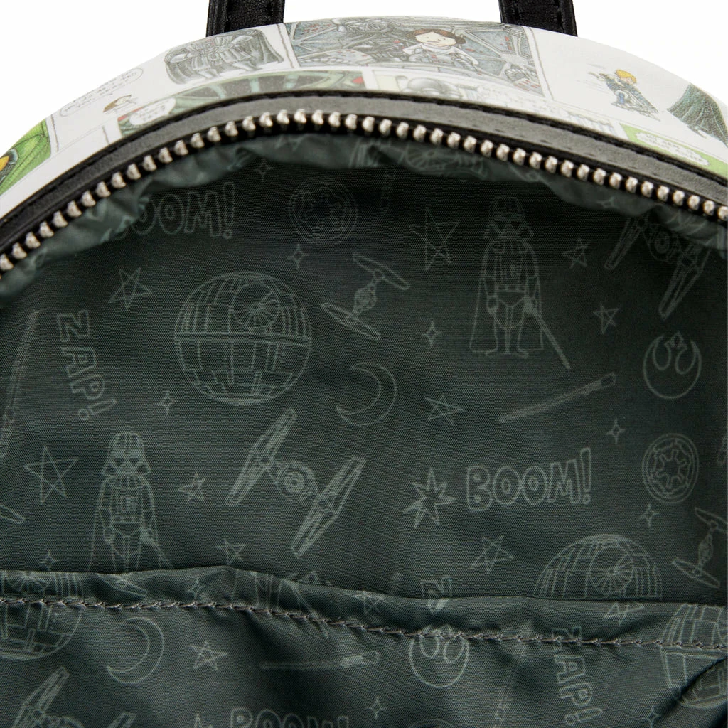 The Loungefly Darth Vader Comic Strip Mini Backpack is made of vegan leather (polyurethane). Backpack has adjustable shoulder straps, sturdy metal hardware, and features printed details. Take note of the coordinating inside lining. Please note: Patterns will vary with all-over-print styles. Not every piece will look identical nor will every piece be an exact match as to what is pictured online