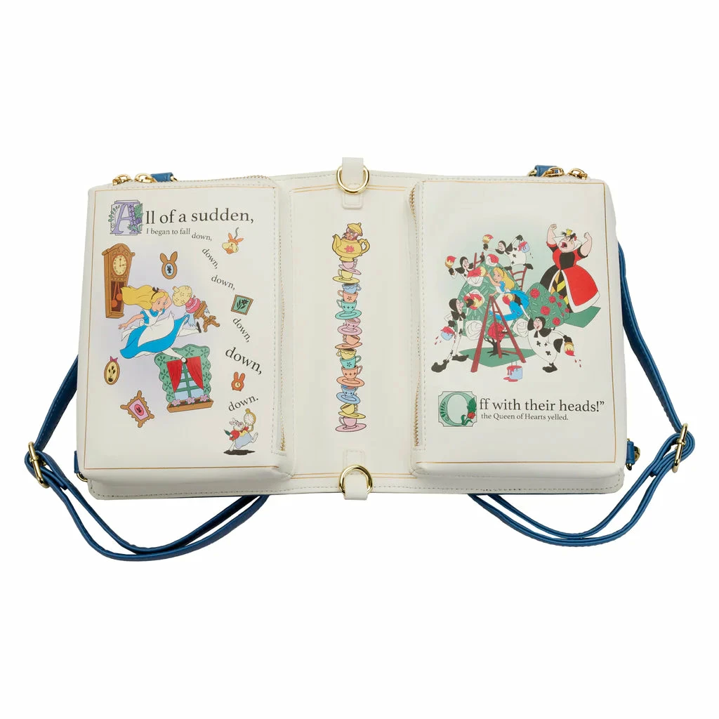 Take a wondrous trip with Alice and capture her adventures with this Alice in Wonderland Book Convertible Crossbody Bag. This convertible bag is shaped like a book and opens up to the pages of Alice’s journeys—from the lessons she learns from the flowers–to her encounter with the Red Queen. Adjustable, removable straps help convert the handbag into a backpack. On the back, the grinning Cheshire Cat makes an appearance. This accessory complements any Disney outfit and is perfect for fans who are looking to keep their favorite animated moments close.