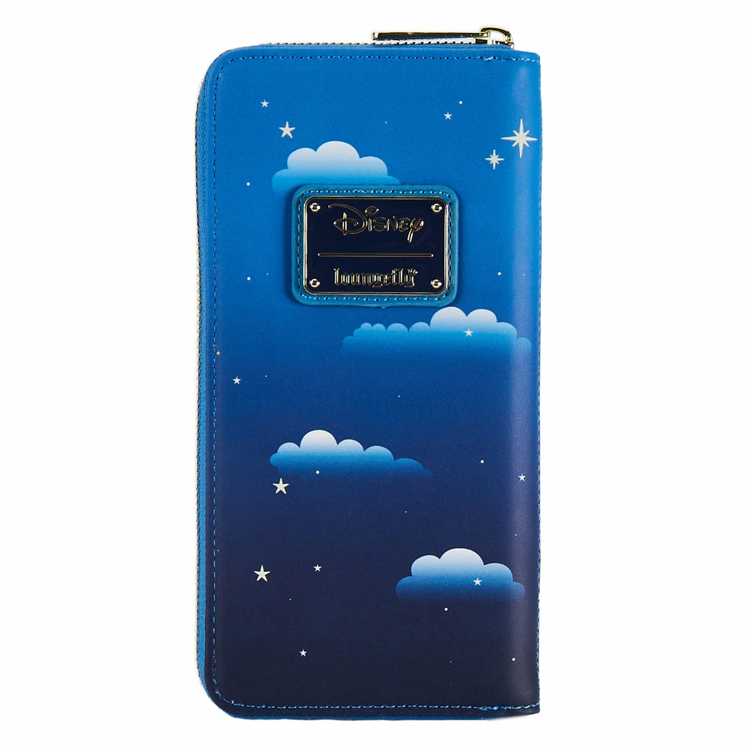 Tink’s pixie dust has set the wheels in motion. Peter Pan will whisk the Darling children away to Never Land. Hang on tight to witness this scene up close with this Loungefly Peter Pan Clock Glow in the Dark Zip Around Wallet.