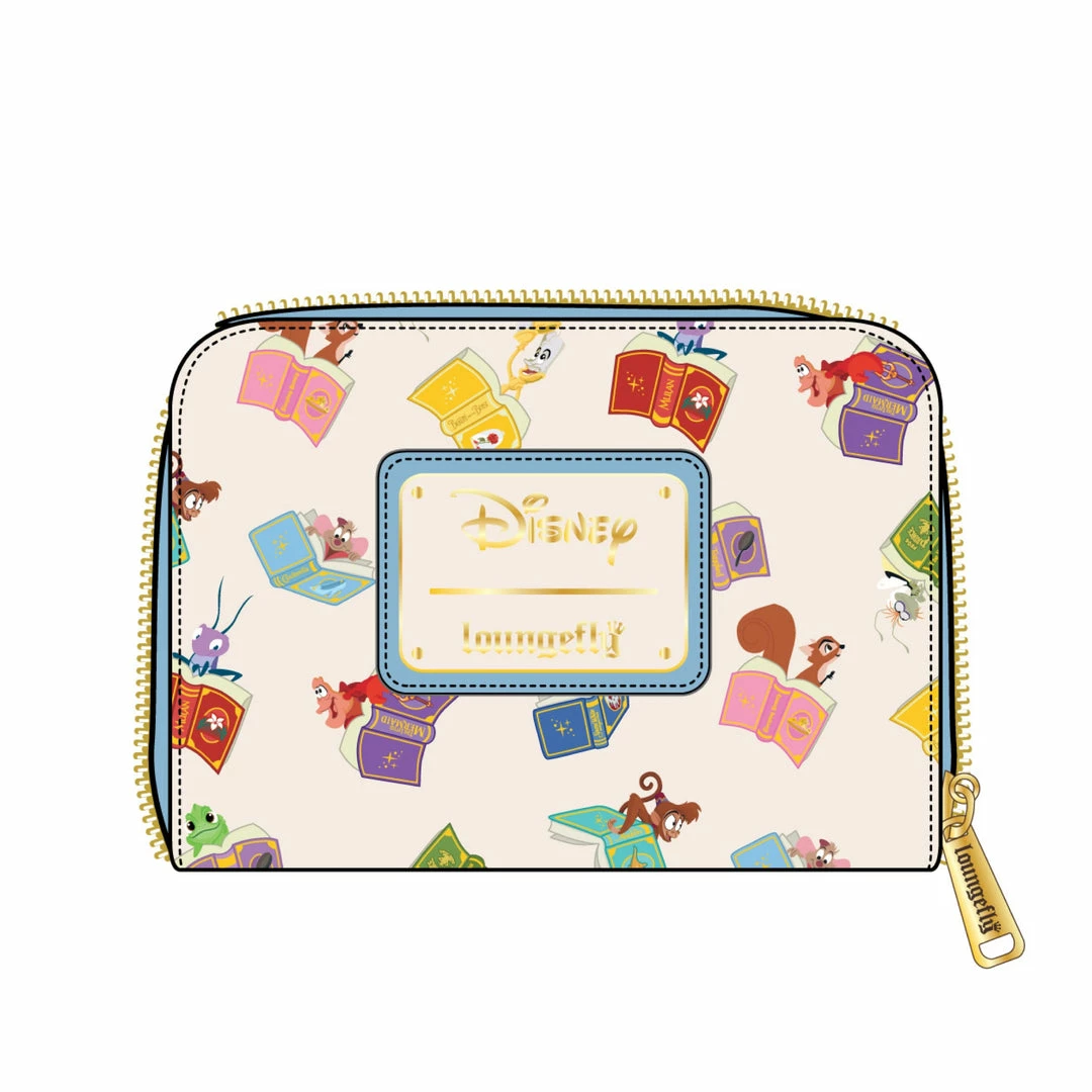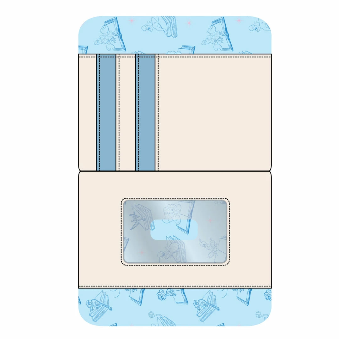 Hit the books like a real Disney Princess: effortlessly! Maintain a smart and stylish look with this Disney Princess Books Classics Zip Around Wallet. The front displays gold-detailed spines of books for classic tales that include eauty and the Beast, Aladdin, Sleeping Beauty, Cinderella, and Snow White and the Seven Dwarfs. The cream-colored background carries a motif of each princess’s pals really getting into Disney Princess books. You might be able to spot Abu, Sebastian, Lumiere, Cri-Kee, Jaq, a very thoughtful squirrel, Pascal, Ray, Dopey, and Flit. Inside, you’ll see the printed outline, in blue, of an open book. This wallet makes for a great complement to any Disney outfit and is perfect for fans wishing to keep their favorite animated movies close. Note the coordinating inside lining.