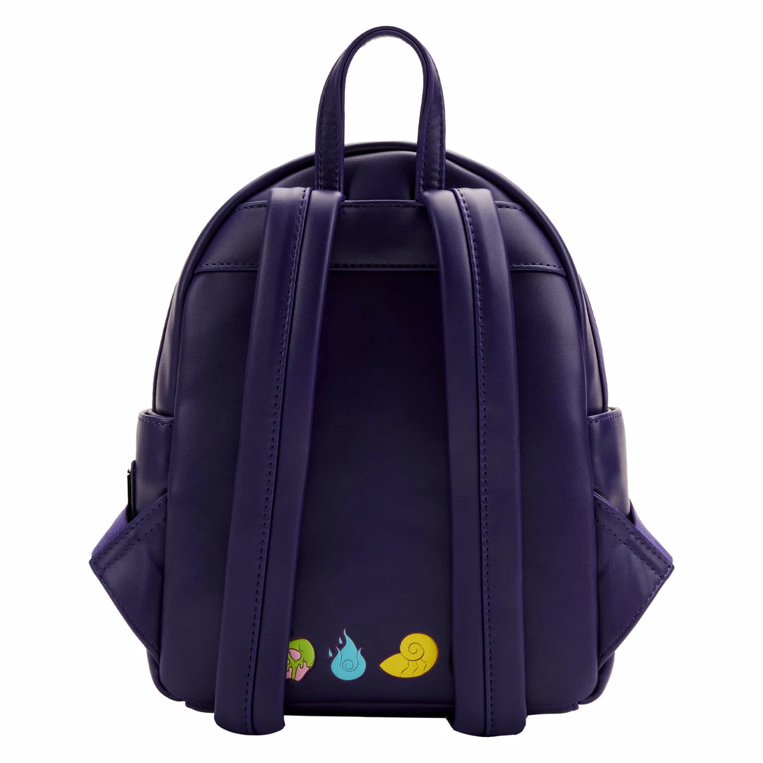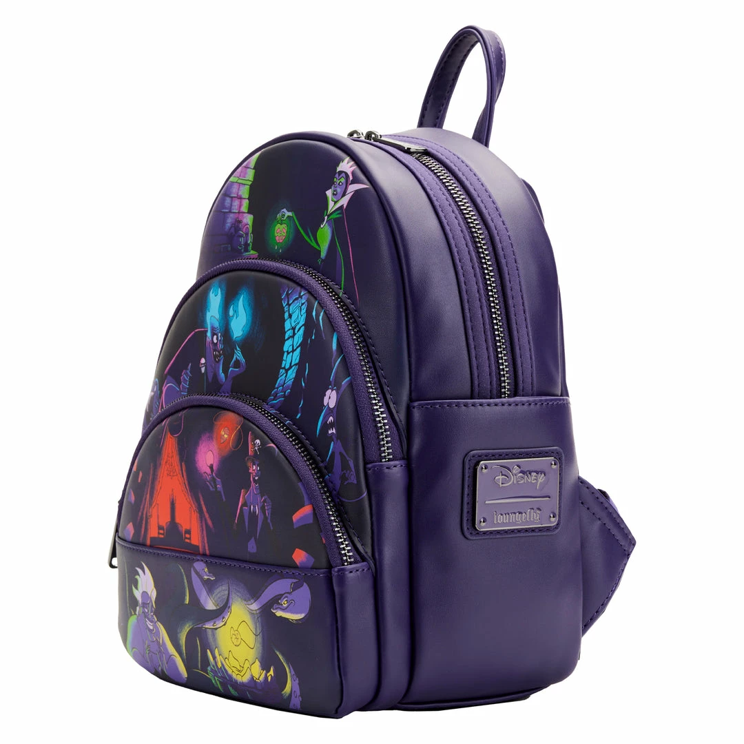 Pick your poison! Three perfectly wicked scenes unfold on this Loungefly Disney Villains Triple Pocket Glow-in-the-Dark Mini Backpack. With three pockets and scenes to choose from, you’ll love tucking away all the things you need to have a scream of a day. Ursula and Dr. Facilier share the spotlight on the first pocket. Below, Ursula’s minions, Flotsam and Jetsam, circle their tails around the cauldron that holds Ariel’s locket—and her voice. An eager Ursula looks ready to wrap her tentacles around the prize. In the dark, the locket and the light surrounding it, glow an eerie golden hue. Above them, Dr. Facilier invites you to see what’s in the cards. He stands before the table set for two, with the curtains drawn open, inside Dr. Facilier’s Voodoo Emporium. It looks like a transformation, with the help of friends from the other side, is about to take place! The mask locket that unleashes mysterious powers glows red—along with the inside of the tent—in the dark. This magical moment, in the dark, draws further light from the globe at the top of Dr. Facilier’s cane, which glows a purplish red. In the middle compartment, Hades holds a blue flame in his fingertips, while Pain and Panic tremble and cower with fear. In the dark, the flame in Hades’ fingertips glows blue—along with his hair and the light cast along the brick that arcs over the scene. At the very top, the Evil Queen reigns supreme—having just dipped the apple into the poison cocktail. It drips into the shape of a deadly skull—and in the dark, it glows a ghastly green—along with a faint light that reflects onto the Queen’s chest and her eyelids. On the back, the symbol for each villain makes an appearance, including the poison apple, a blue flame, a conch shell, and a colorful mask. It’s the perfect accessory for packing all the items necessary to have a spellbinding day—or for transforming everyday travels into frightfully fun adventures.