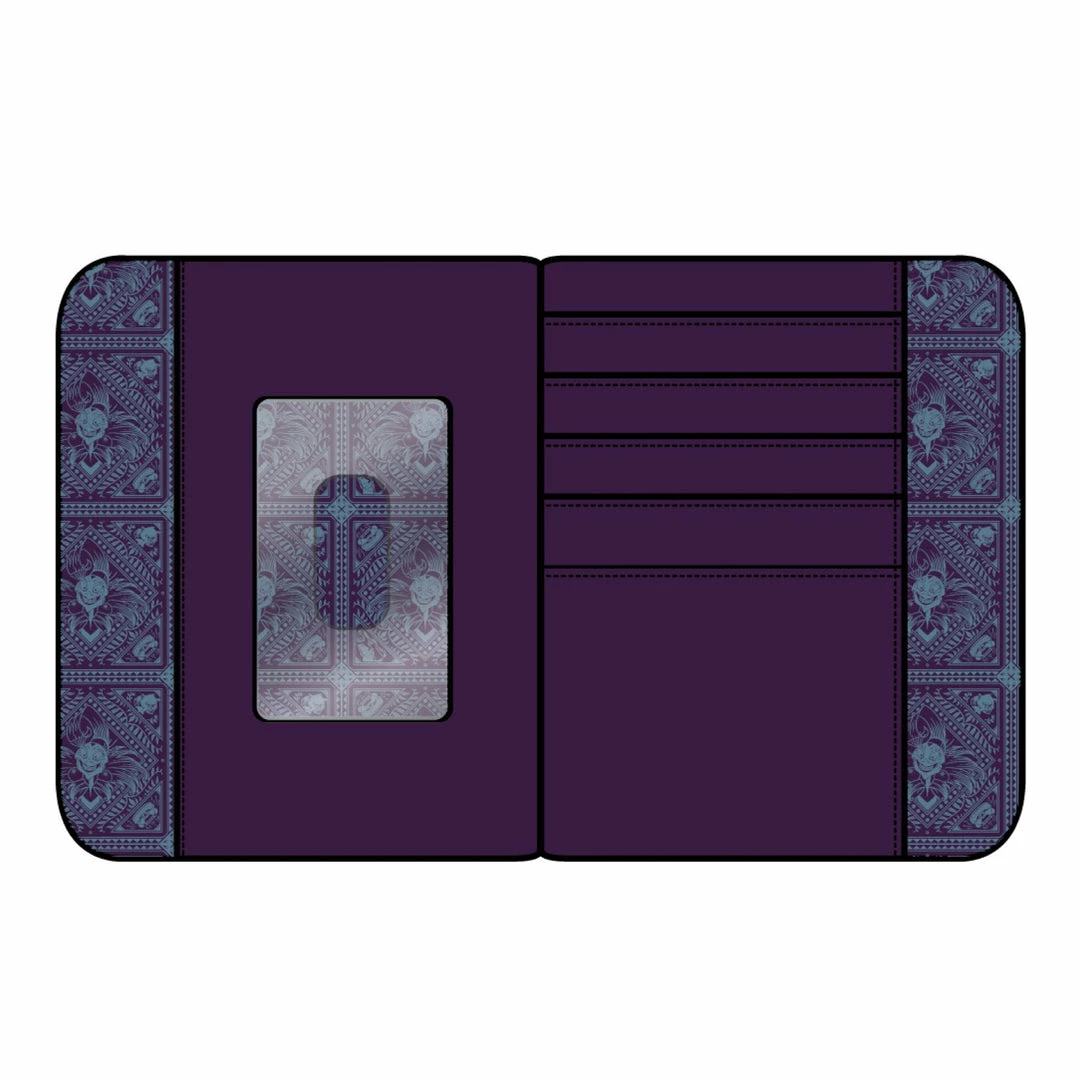Wallet zips closed and includes shiny gunmetal hardware. Additional features include vegan leather (polyurethane), five card slots, a clear slot for holding your ID, topstitching in blue, and applique, embroidered, and printed details. Note the coordinating lining.Â