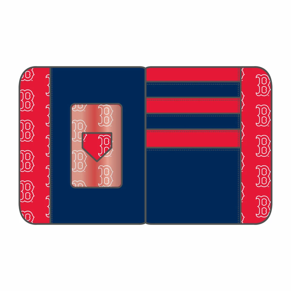 Show your team spirit with an accessory that will knock your Loungefly collection out of the park! The MLB Boston Red Sox Patches Zip Around Wallet is a home run for any Red Sox fan. This wallet features sporty embroidered patches against a navy-blue background. With 4 slots for holding cards and a clear slot to hold your ID, this accessory provides a stylish way to carry your important items as you cheer from the sidelines.