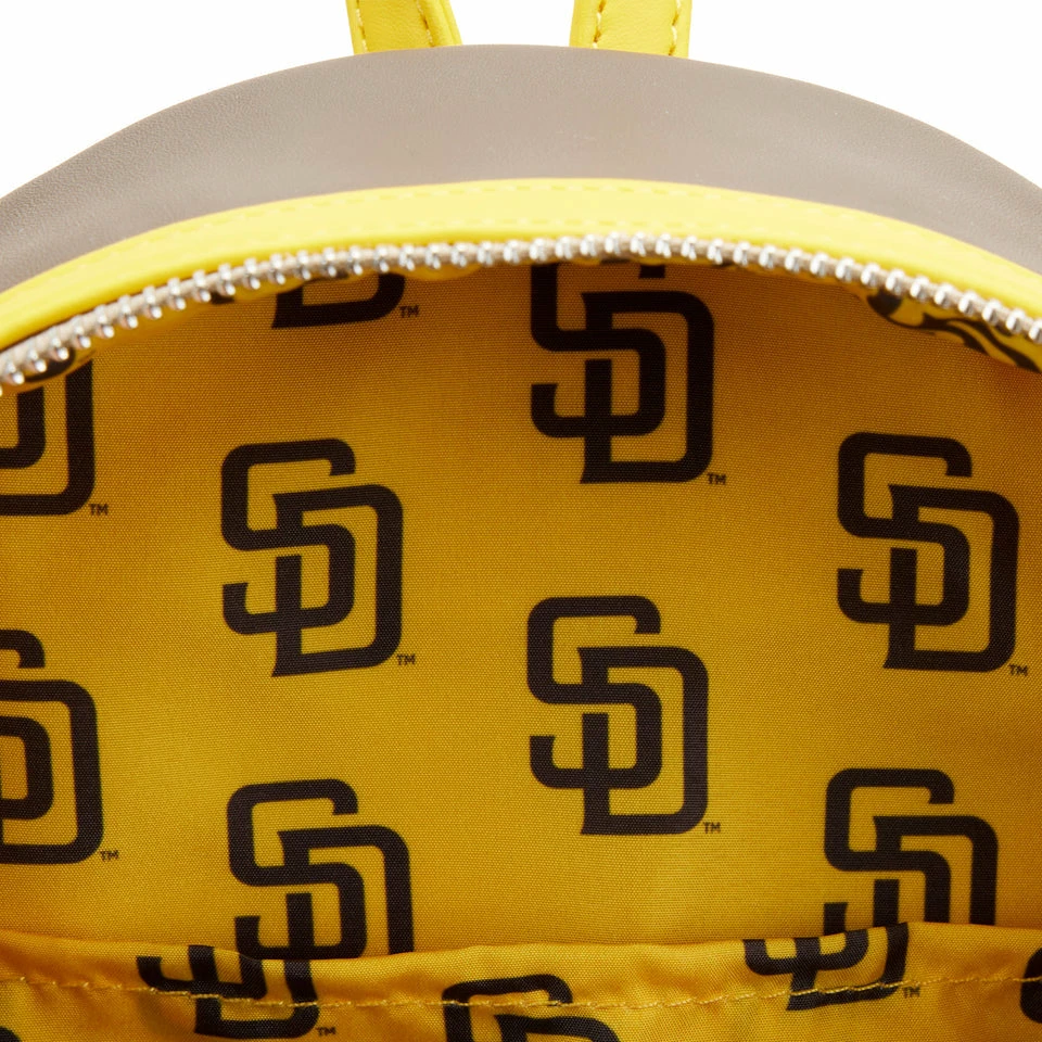 The MLB SD Padres Patches Mini Backpack is made of vegan leather (polyurethane). Bag has adjustable shoulder straps and sturdy metal hardware. Additional features include applique, embroidered, debossed, printed, and patch details. Take note of the coordinating pattern of the inside lining.