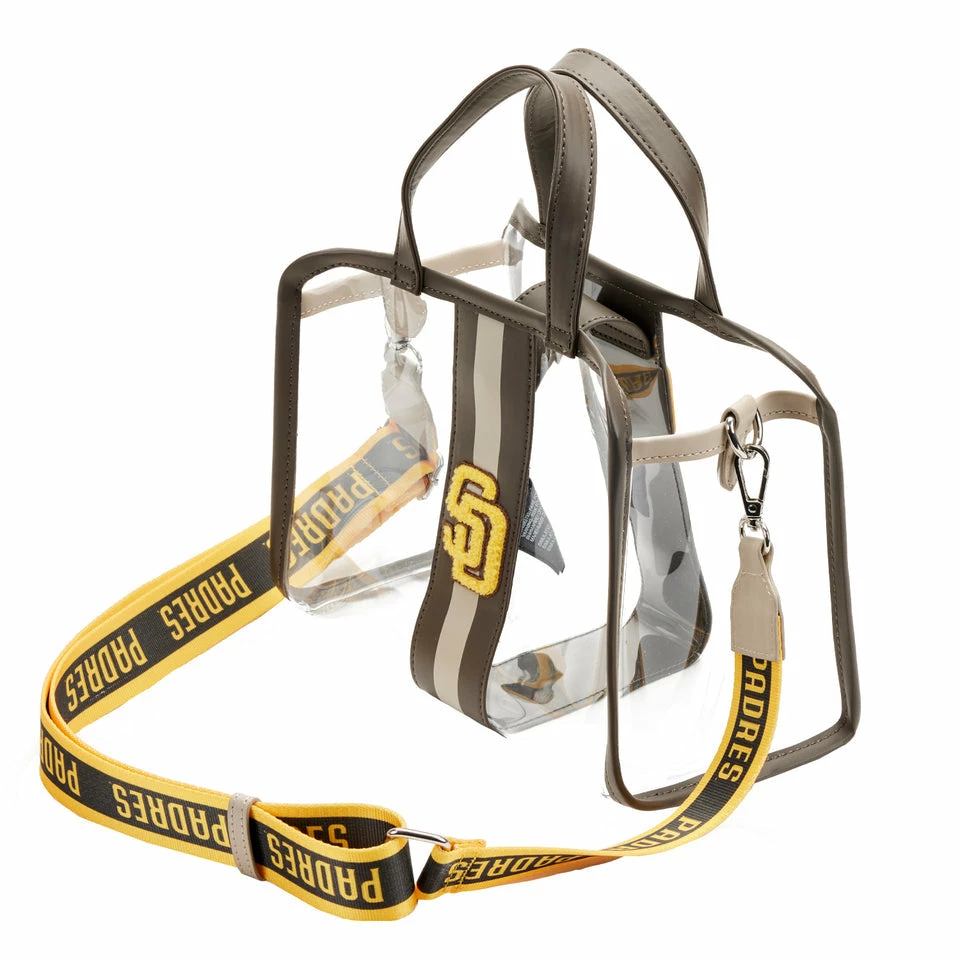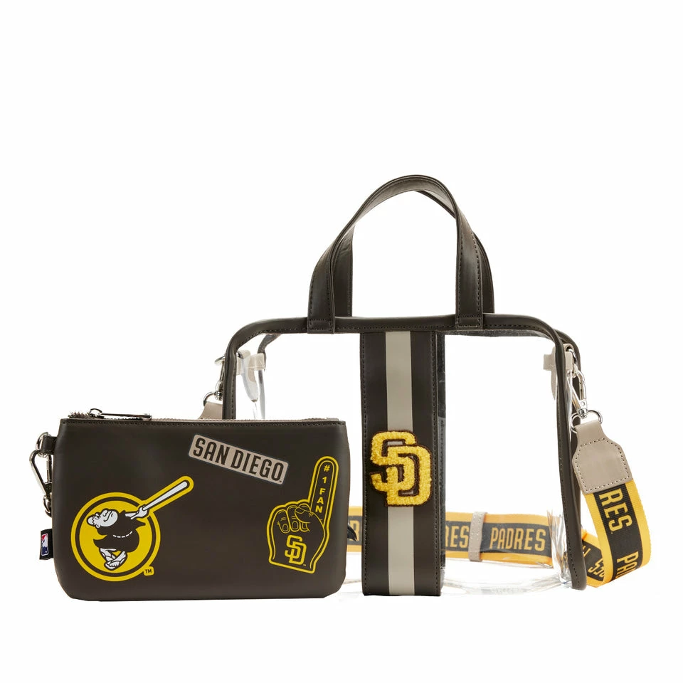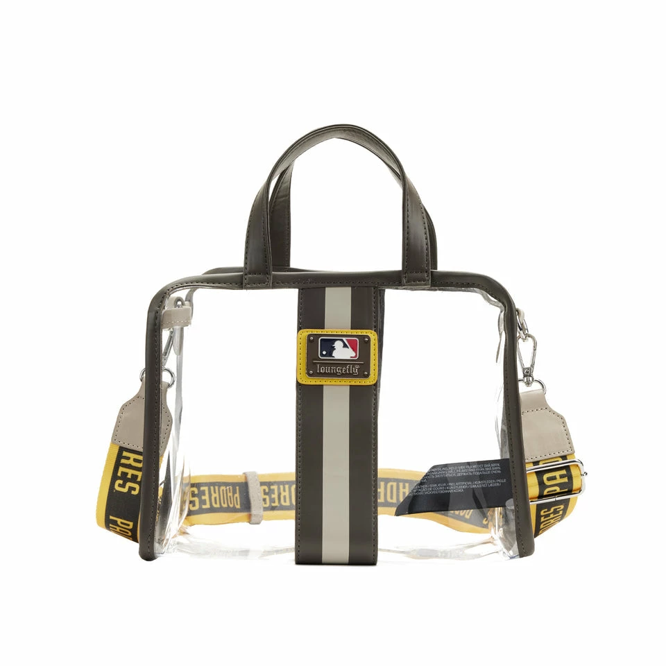 Show your team spirit with an accessory that will knock your Loungefly collection out of the park! The MLB SD Padres Stadium Crossbody Bag with Pouch is a home run for any Padres fan. Made of clear PVC material, this bag is perfect for bringing your gameday essentials into the ballpark. The team’s logo appears on the bag’s center and along the black, adjustable strap. Featuring sporty embroidered patch details, the inner detachable zipper pouch has plenty of room to hold your important items. This multi-functional bag provides a stylish way to transport your gear as you cheer on your team from the sidelines.