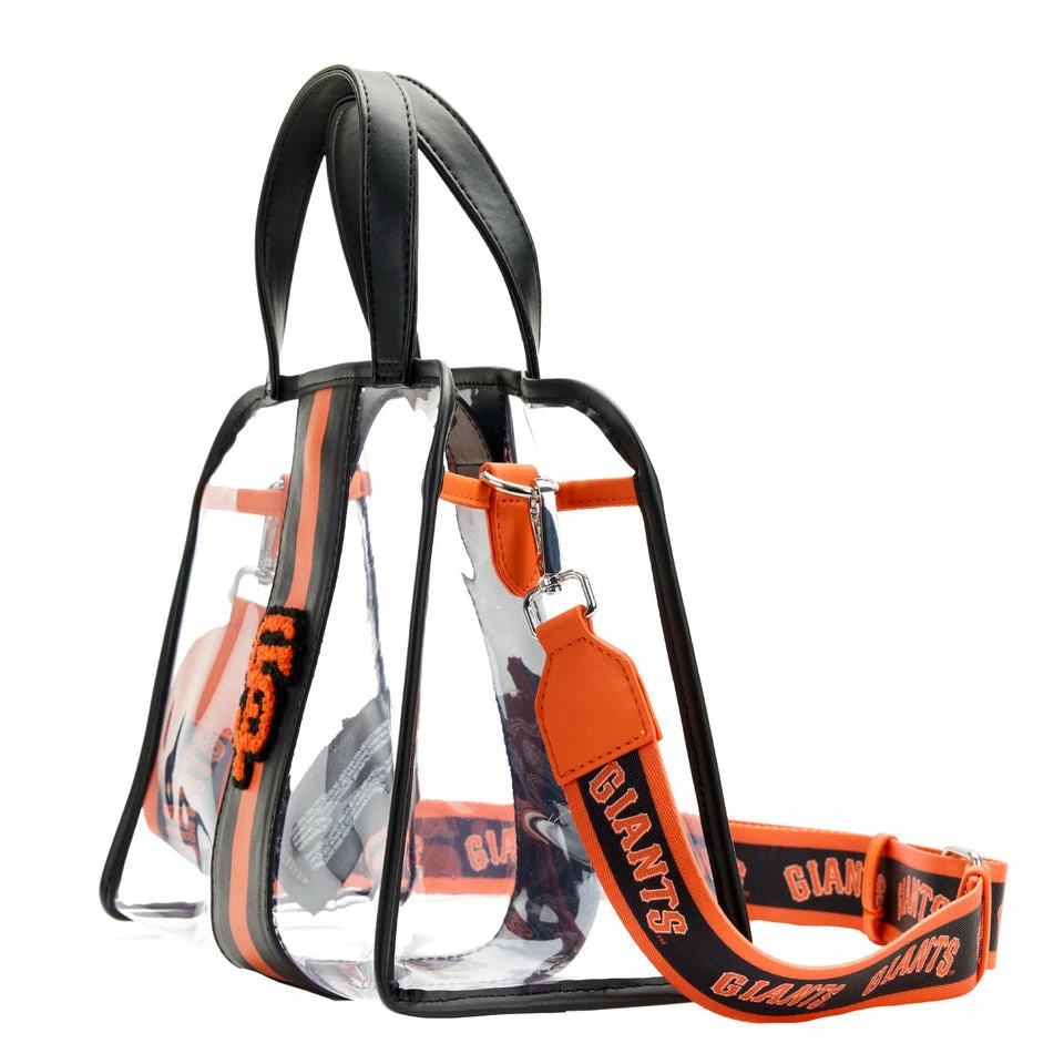 The MLB SF Giants Stadium Crossbody Bag is made of clear PVC with vegan leather trim, and the removable inside pouch is made of vegan leather (polyurethane). Bag has adjustable, detachable shoulder strap and sturdy metal hardware. Additional features include printed, embroidered, and patch details. Take note of the coordinating inside lining of the removeable pouch.