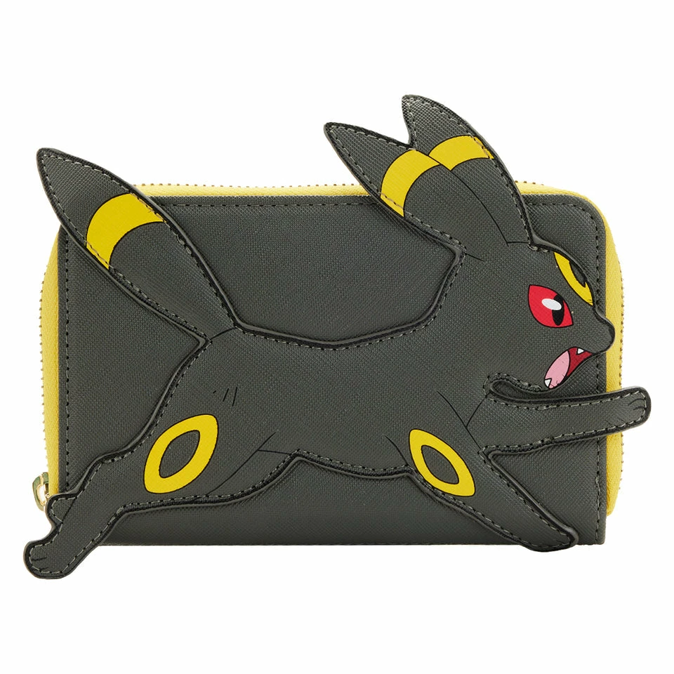 Be swift to leveling up your Pokémon apparel with the Loungefly Pokémon Umbreon Cosplay Zip Around Wallet! This stylish, Dark type wallet can fit a bunch of supplies and necessities for any quest. This design features 4 slots for holding cards, a clear window slot for holding your ID, and a zips closed to keep everything contained. On the back (in the bottom right corner) you’ll find Umbreon’s national number, 197, in yellow. The yellow stripes and red eyes pop against the black background.