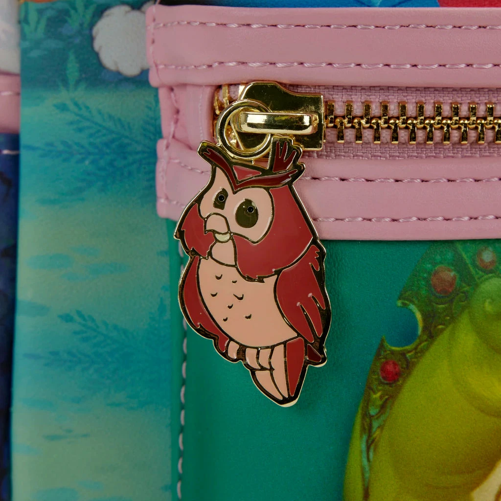 Awaken the magic of a fairy-tale dream with this Loungefly Disney Sleeping Beauty Princess Scenes Mini Backpack. On this backpack, a dream sequence of favorite animated scenes evolves in vivid color and exquisite detail. Capture your favorite Sleeping Beauty moments and keep them close on all your journeys. On the front of this backpack, a zipped compartment displays, in rich color, Aurora, dreaming. On the top, the faces of Flora, Fauna, and Merryweather watch over her. Above the zipped compartment, Aurora and a woodland owl, suited up as a suitor, dance in the forest. In fact, an enamel zipper owl charm swoops in to complete the look. The side pockets each contribute a part of the story as well. Maleficent appears on one pocket, and her evil dragon form appears on the other. On the back, Aurora and Prince Phillip embrace for true love’s kiss and live happily ever after. This backpack is the perfect accessory to pair with a Disney outfit or for transform everyday outings into magical adventures.