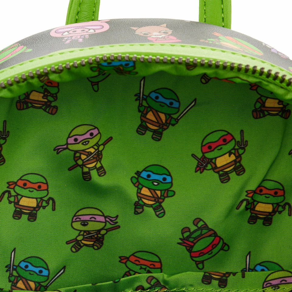 You’ll flip your lid when you see the Teenage Mutant Ninja Turtle Sewer Cap AOP Mini Backpack! Heroes in a hurry need supplies and snacks for the road, so snag this stylish mini backpack to contain your power snacks. The round front pocket looks like a sewer manhole cover with the TMNT logo on it, while the background pattern is covered with chibi versions of the classic characters. The green shoulder straps, zipper, handle, and trim accent the design perfectly. Don’t forget the pizza enamel zipper charm!