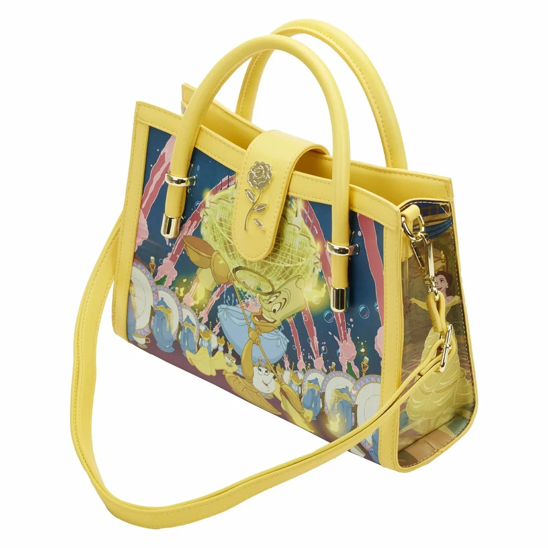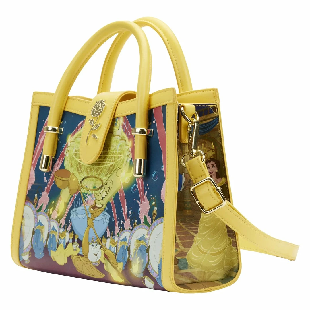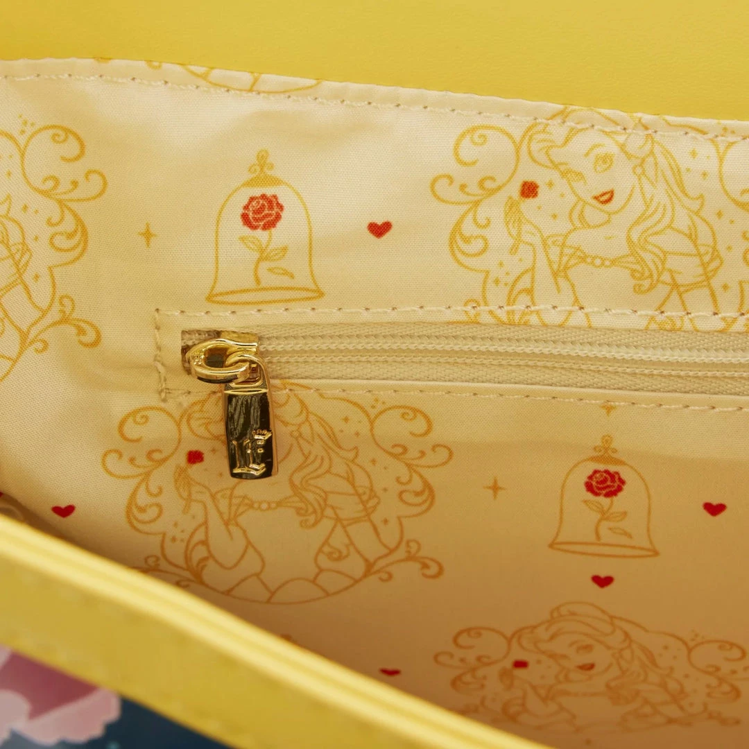 You’re invited as a special guest! Access front-row seats to witness Belle’s enchanting story as it plays out on this Loungefly Disney Beauty and the Beast Belle Princess Scenes Crossbody Bag. Through stunning, original in-house art, scenes from Beauty and the Beast unfold on all sides! First, set the table and light the candles! A show-stopping grand finale awaits as Lumiere takes center stage, and the chandelier forms a spotlight. The dishes line up, and the champagne corks pop in a dazzling display. A layered vegan leather (polyurethane) rose clasp at the top completes the spectacle. Scenes wrap around on the side panels, too! On one side, Gaston shows off in the tavern—especially his ability to use antlers in all his decorating. On the other side, Belle and the Beast twirl and dance in the ballroom. The scene on the back takes place in a wintery landscape. The Beast holds a tiny bird, while Belle welcomes in more winged creatures, wondering what it is she hadn’t seen before. This crossbody bag is the perfect accessory for any Disney outfit—or for turning everyday travels into enchanting adventures.